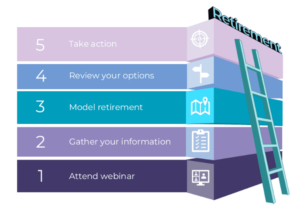 We’ve created a simple 5-step journey to help you plan for the retirement you want. Some of these steps include interactive webinars and additional resources to support you along the way. We recommend starting by exploring the five steps below before diving into the content available in this resource centre.